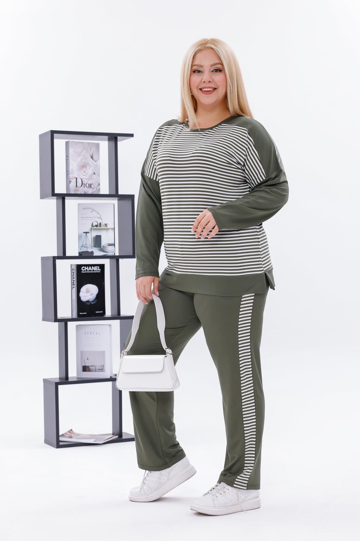 Büyük Beden Çizgili Pamuklu Likralı Takım (6K-TKM0005-HAKİ)