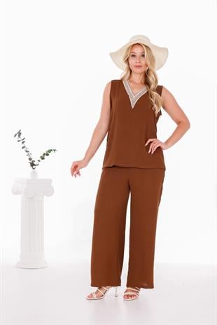 Büyük Beden Dantel Yaka Ayrobin Kumaş Takım (5Y-TKM00057-KHV)