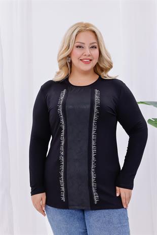 Uzun Kol Bluz Büyük Beden Deri Detaylı Taşlı Bluz