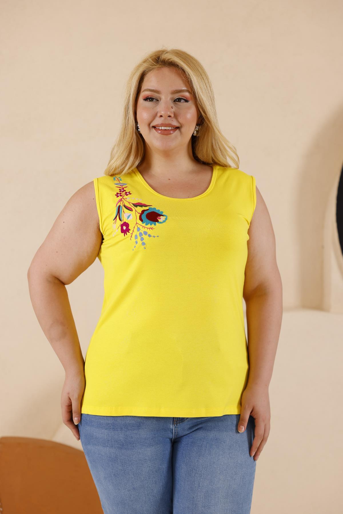 Büyük Beden Nakış Detaylı Pamuklu Bambu Atlet (5Y-BLZ00074-SARI)