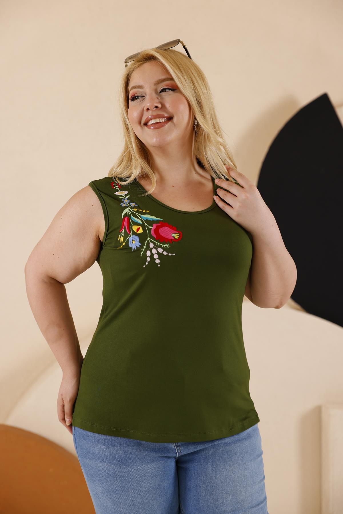 Büyük Beden Nakış Detaylı Pamuklu Bambu Atlet (5Y-BLZ00074-HAKİ)