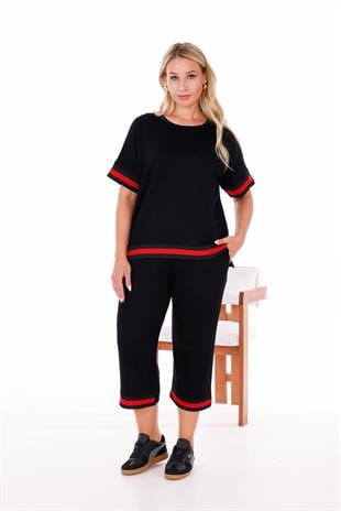 Büyük Beden Şerit Detaylı Pamuklu Likralı Kapri Takım