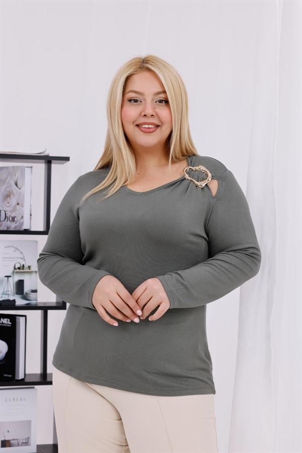 Büyük Beden Toka Detaylı Likralı Çilek Kumaş Bluz (6K-BLZ00016-HAKİ)