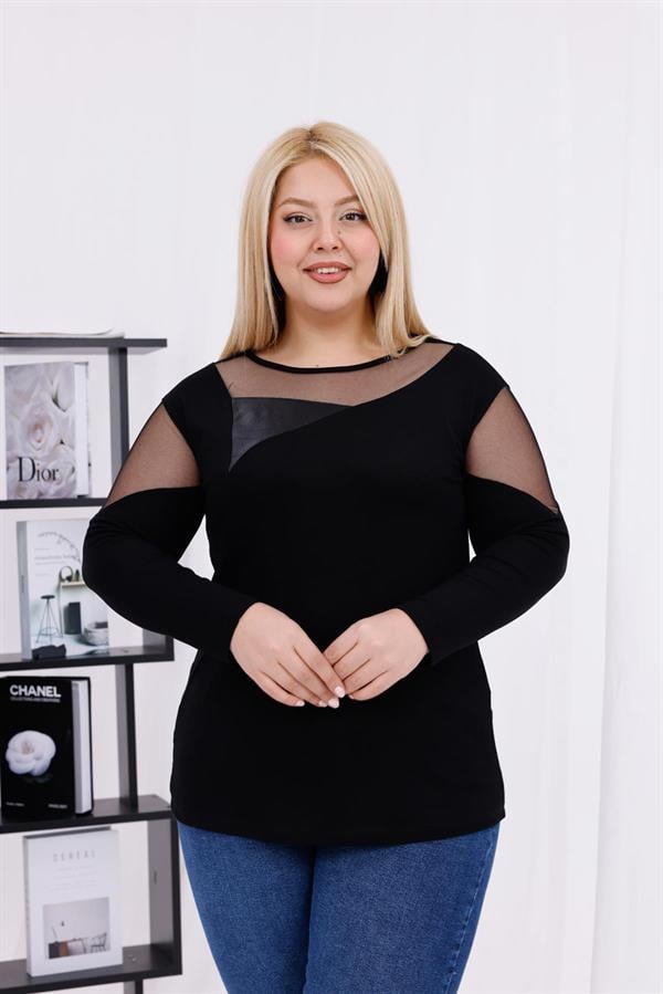 Büyük Beden Tül Detaylı Çilek Kumaş Bluz (6K-BLZ00017-SYH)