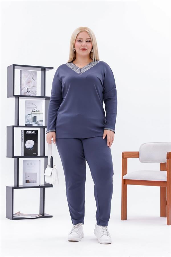 İkili Takım Büyük Beden V Yaka Taşlı Modal Takım