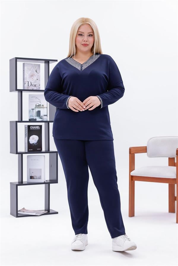 İkili Takım Büyük Beden V Yaka Taşlı Modal Takım