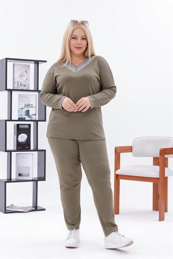 Büyük Beden V Yaka Taşlı Modal Takım (6K-TKM0001-HAKİ)