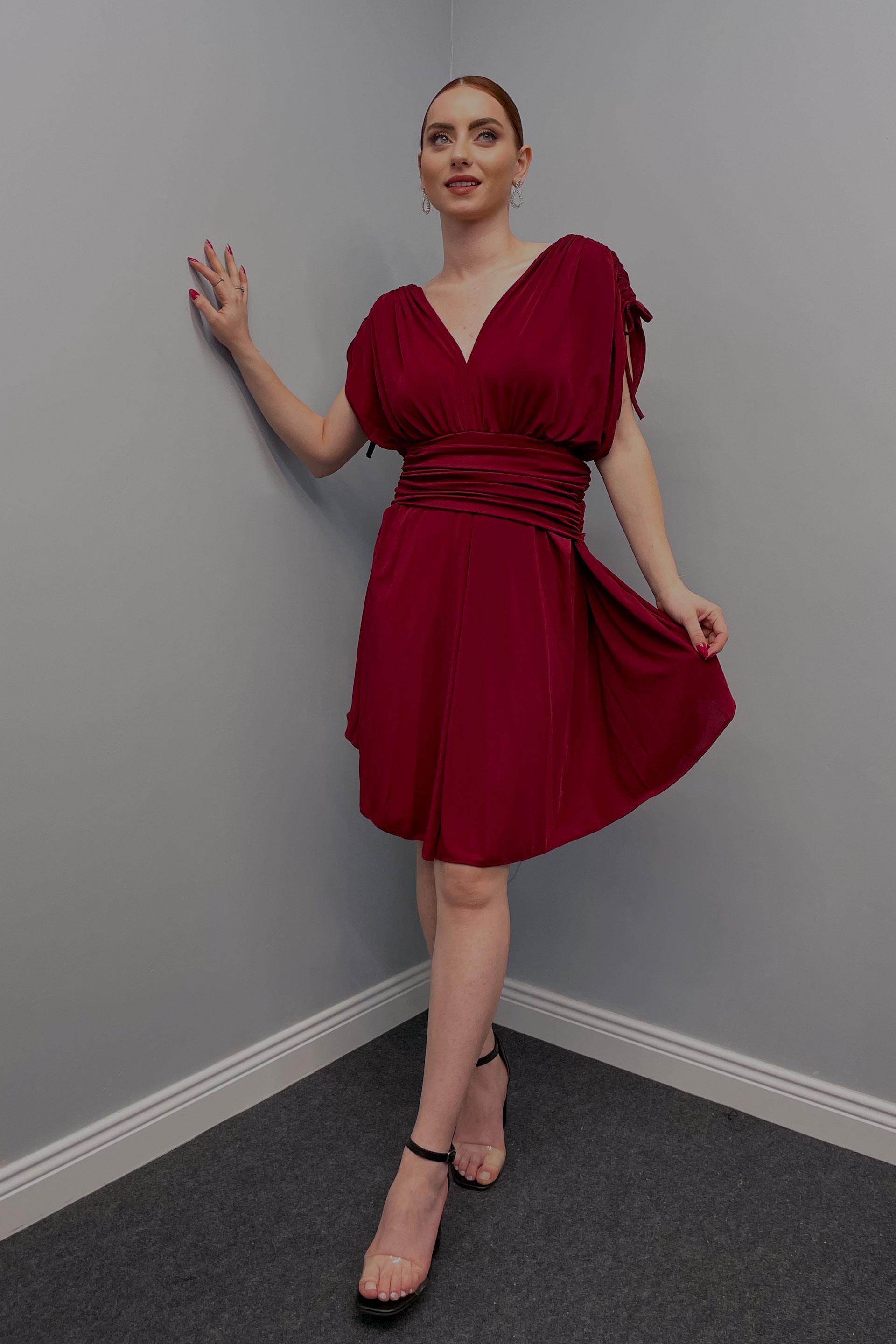 Elbise Kadın Omuz Büzgülü Drapeli Elbise Bordo
