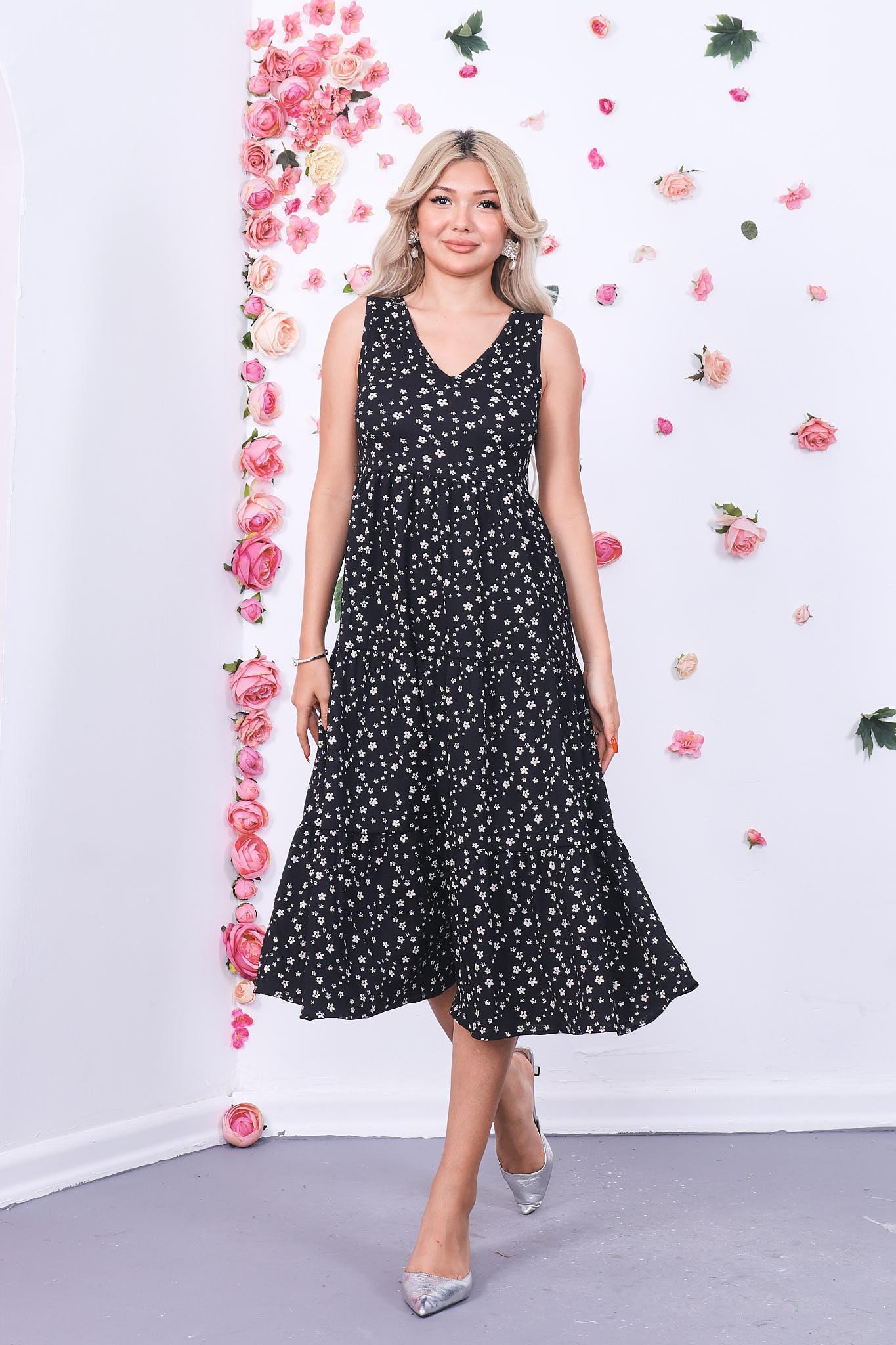 V Yaka Çiçekli Pileli Elbise (4Y-ELB0123-SYH)